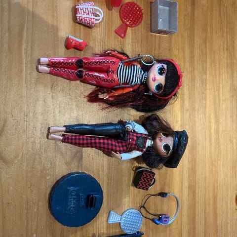 Barbie dukker med ulike antrekk og tilbehør. Inkluderer to Barbie dukker med kjoler i forskjellige farger og mønstre, samt tilbehør som veske.