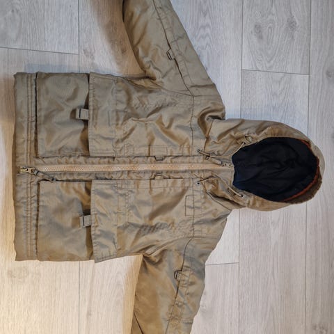 Flott jakke fra Benetton i armygrønn farge. Rutet mykt for i hette. Str 100 cm, tilsvarer omtrent str 98-104. Oppleves som noe romslig i størrelsen.