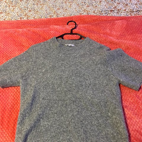 Gina Tricot genser i størrelse M, farge grå. Materialblanding: 68% polyester, 22% polyamid, 7% ull, 1% viskose, 2% elastan. Genseren har et hull i stoffet som vist på bilde.