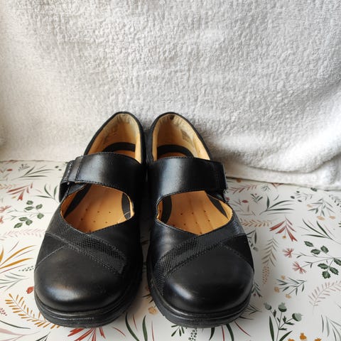 Sko i 100 % sort glatt skinn, stabil modell med middels høy gummisåle.