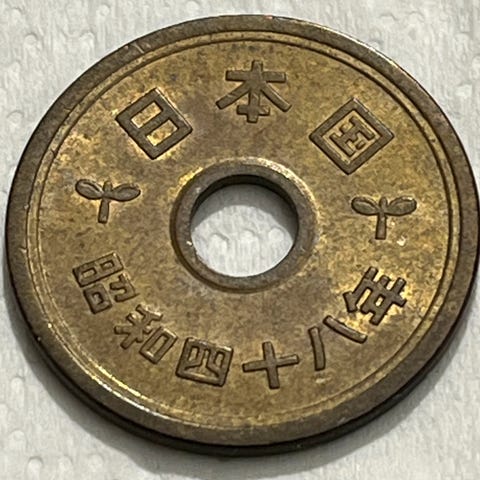 Japansk 5 yen mynt med hull i midten