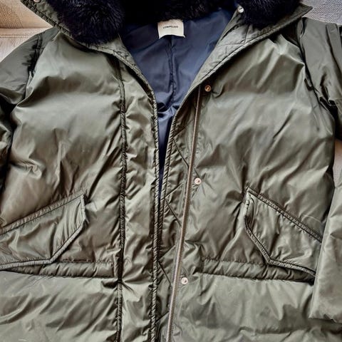 Pent brukt Lempelius dunjakke. Olivengrønn med avtagbar skinnhette. Helt perfekt stand, varm og nydelig vinterjakke.