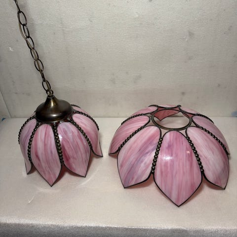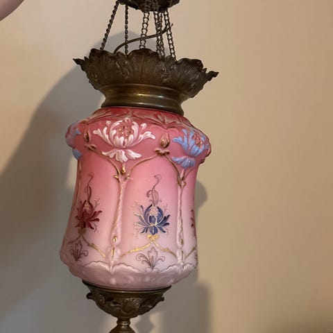 Eldre lampe i glass med hvit/gjennomskinnelig, og rosa farge, selges kr 300.