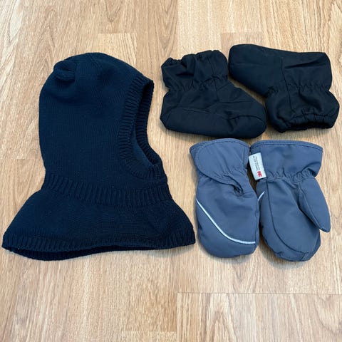 Selger fotposer fra Polarn i puter str 9 mnd, fotposer 100 % ull, lue og votter fra Polarn i pyret 4-9 mnd, grå lue str 12-18 mnd.