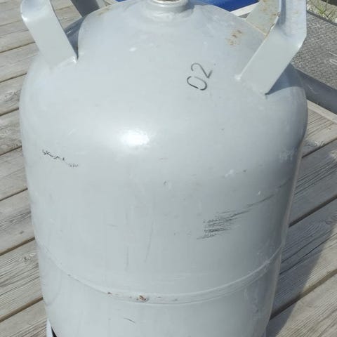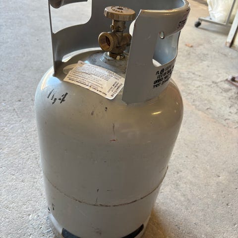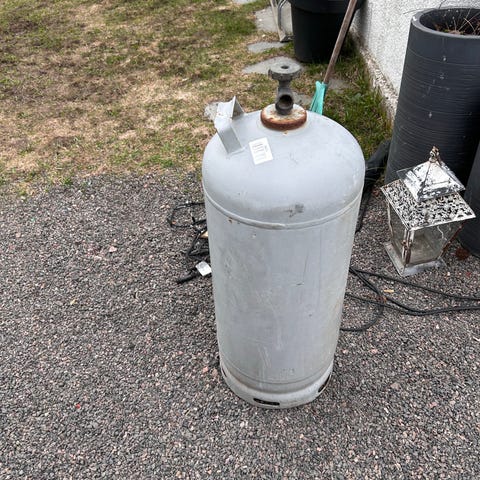 Flaske i stål for 11 kg propangass. Med industrikobling