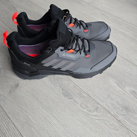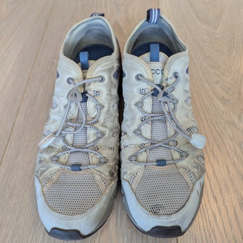 Vernesko i lær med stålhette. Jeg bruker normalt 46, disse passer greit.