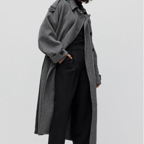 Modellen har lange, vide ermer med lav skuldersøm, brede jakkeslag og klafflommer. Den er dobbeltspent med kontrasterende knapper og har en boxy, rett passform som gir et både elegant og avslappet uttrykk.