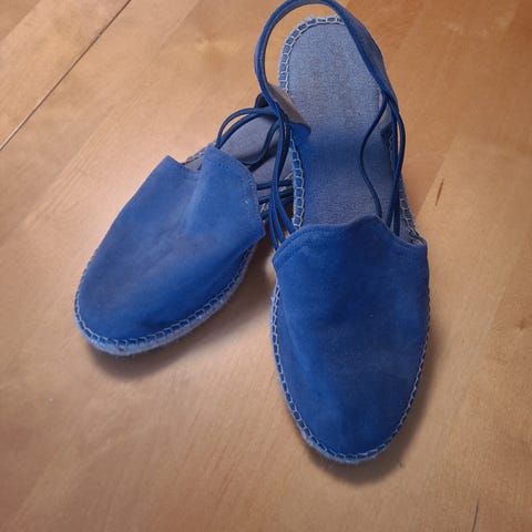 Selger et par pent brukte espadrillos i beige semsket skinn fra merket Kanna. Skoene har en lav kilehæl og innersåle i mykt skinn. Skoene er av god kvalitet, kjøpt på Sapatos i Bogstadveien.