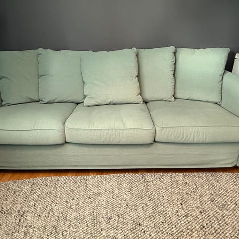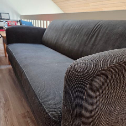 God sofa og sitte i og er bare 2 år men har blitt litt nuppete da en katt har gått rundt på den. Litt stivt stoff så blir enda bedre med et mykt teppe over. Fungerer fint med et stor teppe en fester inn i kantene og så kan en endre utrykk på sofaen etter rommet den står i