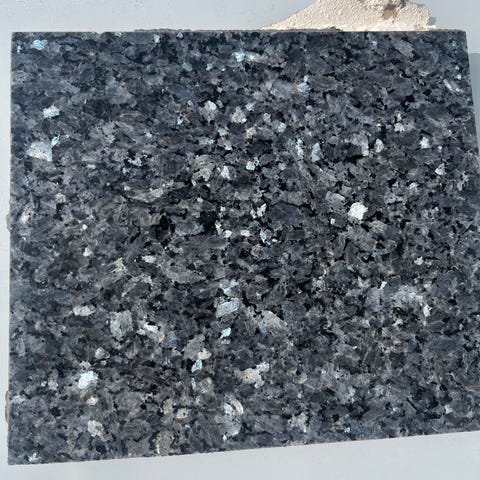 Larvikitten består av feltspat, og krystallene er sammensatt på en slik måte at det fremkommer et blå-grønt fargespill når kjøkkenlyset brytes i ørsmå lameller internt i dem. Overflaten har et flott spill, jeg tror det kalles høyglanspolert. Undersiden er sagkuttet og plan.