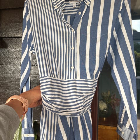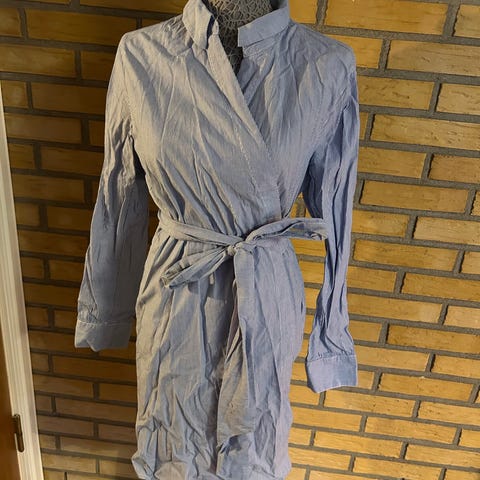 Superdry tunika for dame i størrelse L. laget i bomull og har blått stripemønster. Skjortekjolefasong med krage, knappelukking foran og knytebelte i livet. 3/4-lange ermer med mansjetter og brystlomme på venstre side.