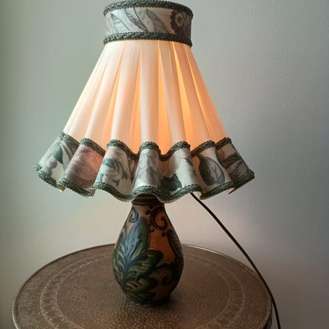 Gammel lampe. 69 eller 70 cm høy. Må ha ny stikkontakt. Denne lampeskjerm fikk min mor brodert i en skredder/sy butikk hvor hun skiftet ut det gamle stoffet på lampen og valgte en dyp rødfarge ❤️