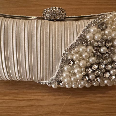 Dekorert med glitrende steiner og perler som gir et eksklusivt og elegant uttrykk.