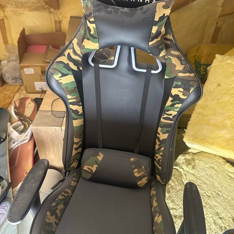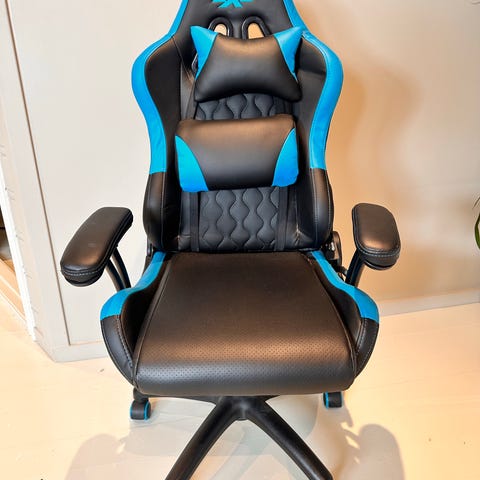Gamingstol fra Biltema. Ikke vært i bruk da jeg ikke likte den. Mangler et plastpanel på siden av ryggen som knakk under montering. Kan overleveres i Gjøvik/Land/Toten