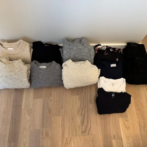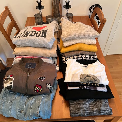 Selger klær i størrelse XS, alt fra basic tskjorter til finere topper, hettegensere og olajakker/jakker.