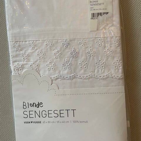 Nytt sengetøy med putetrekk til babysengen. Det hvite fra JYSK (65x80) ble åpnet ved en feiltakelse, men aldri brukt fordi jeg kjøpte feil størrelse.