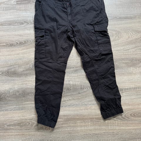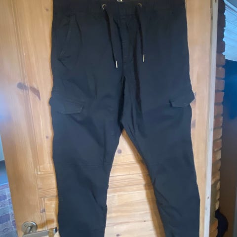 H&M bukser for menn i størrelse L, grå farge. Bukser med elastisk midje og snøring, lommer på siden og bak, samt ribbestrikkede ved anklene. Laget i et materiale som gir komfort og bevegelsesfrihet.