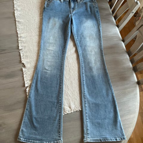 Flared jeans i blågrå farge, størrelse S petite så passer XS med midjevidde W25. Passer jenter med middels/kort lengde på beina. Bare brukt i bildet. Start pris 200kr(130kr nå) send meld om annen pris/info hvis ønsket.