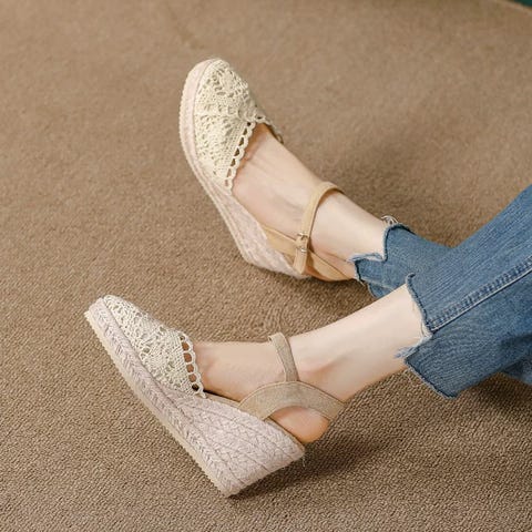 Hæler i størrelse 36 med kilehæl. Skoene er beige og har en ankelstropp med mønstret bånd. Materialet inkluderer tekstil og flettet materiale på hælen og sålen.