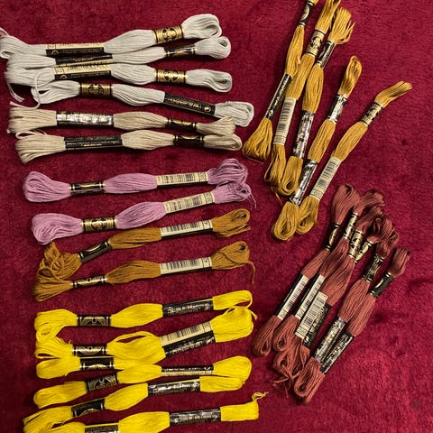 Ukjent merke broderigarn sett bestående av flere farger. Laget av bomullsmateriale, egnet for håndarbeid og brodering.