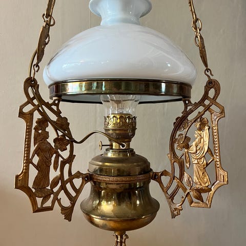 En fin liten gammel bordlampe som høyst sannsynlig er hjemmelaget. Det er montert en messingtopp merket Fuhrmeister - Made in Norway på toppen av noe som kan ha vært en vase i hvitt glass ? Fuhrmeister produserte primuser mm. Nydelig, mulig håndmalt dekor 🤩 Fin gammel pæreholder i messing og porselen, ganske lang ledning med gammel trykkbryter og gammelt ujordet støpsel. Lampen er 16 cm høy, bunnen er 12 cm i diameter, selges uten lyspære.