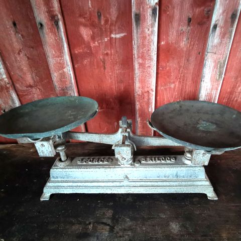 Kolonialvekt fra 1890-1900 med all slitasje intakt. Fin patina, men kan muligens bli enda bedre ved fjerning av maling på front. Støpejern, tung og stabil. Perfekt butikk-dekorasjon. Mål : 46 x 20 cm. (54 x 24 cm med messingskål) Kan sendes.