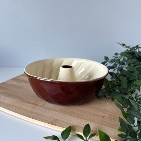 Vintage kakeform i glassert keramikk. Veldig god å bake da den holder på varmen og gir jevnere steking enn aluminiumsformer. Er samtidig dekorativ på veggen når den ikke er i bruk.