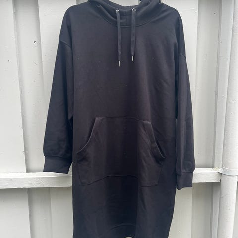 Selger en stilig og komfortabel hettegenserkjole i svart, strl L. Kjolen er ca. 90 cm lang og har en praktisk splitt på siden. Laget av 95% bomull og 5% stretch – perfekt for både hverdag og avslapning.