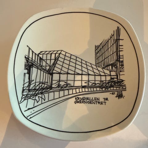 Stilig retro fat fra Figgjo med dekor av Simongården i Sandnes, der Mauritz Supermarked åpnet i 1962. I veldig god stand for alder, ingen nagg eller skår, blankt og fint. Fatet måler 19 x 19 cm.