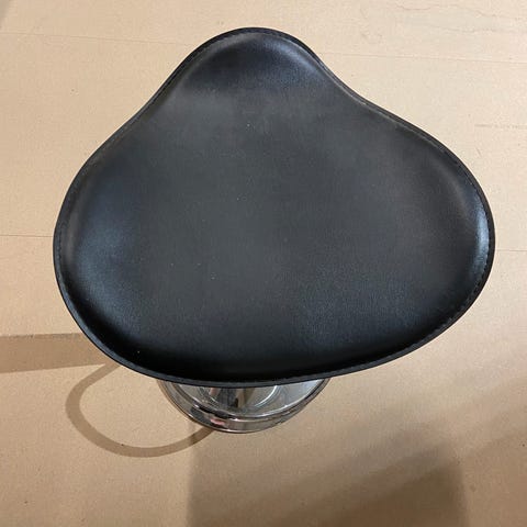 Stolen kan heves og senkes med pedal . Går på hjul . Brukt som frisørstol . Må hentes på Hamar .
