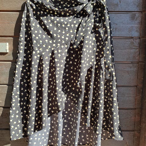Står str S, men passer helt fint til meg som ofte bruker M. Hel lengde 82 cm, lett utskrådd. Laget av lett materiale, faller veldig fint.