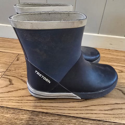 Pent brukt Tretorn barn gummistøvler i størrelse 30, unisex modell. Støvlene er blå og laget av gummi med fôret innside for økt komfort og varme. Egnet for bruk i vått vær og utendørsaktiviteter.