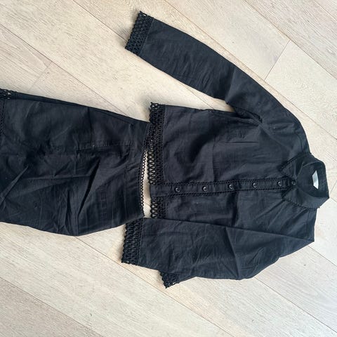 Bluse i størrelse M, svart farge, laget av 100% polyester. Passer for kvinner. Blusen har et teksturert mønster og lange ermer med mansjetter.