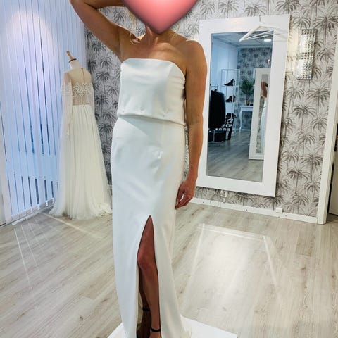Selger min nydelige brudekjole fra Maggie Sotero. Kjolen er kjøpt på Belle Amie våren 2024, pris rundt 19000 kr ny. Selges sammen med sløret dersom ønskelig, men sløret har en rift. Kjolen er renset etter bruk. Det er dessverre litt grønske på slepet som ikke lot seg fjerne i rens. Det er ikke så lett å se, bilder kan tas på forspørsel. Ellers er den i god stand.