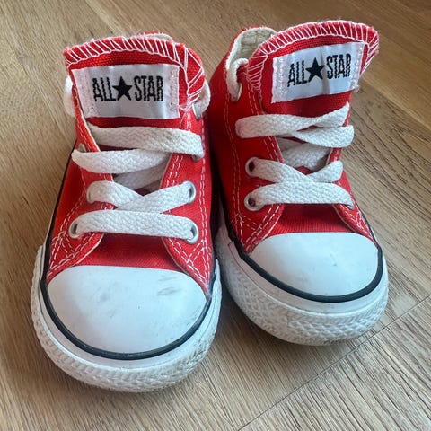 Converse barnesko i størrelse 21, unisex modell. Skoene er laget av rødt stoff med hvite detaljer og gummisåle. Designet som høye sneakers med snøring foran. Egnet for barn.