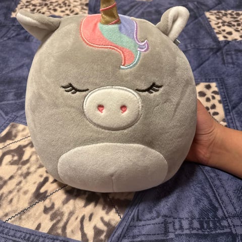 Squishmallows myke kosedyr med ulike dyremotiver inkludert enhjørning, kanin og andre dyr. Kosedyrene har fargerike detaljer som prikker, glittereffekter og tilbehør som hatter og blomster. Passer for barn som leker med eller samler på myke kosedyr.
