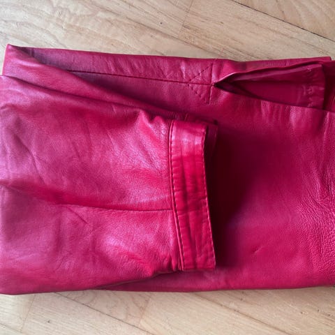 Nydelig vinrødt mykt skinnskjørt selges 🤩 Skjørtet er kjøpt i Italia og er i særdeles god stand til å være fra 80-tallet 👌🏻👌🏻👌🏻 Det lukkes med glidelås og knapp i midjen, og har fastmontert underskjørt og liten splitt nederst på venstre ben. Hemper på innsiden for å kunne henges opp. Bitteliten avskalling av farge øverst på høyre side linning og i søm venstre side linning, men det er også eneste skade (se de to siste bildene)