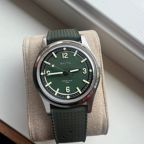 Den har en bitteliten bulk i selve rammen rundt uret noe man ikke legger sånn veldig merke til også har den et par små riper som ses fra en vinkel. Klokken trenger også en liten service da den pleier og stoppe og gå litt også går den noen minutter bakpå, men er ganske sikker på at den bare trenger en liten service.
