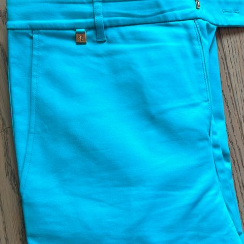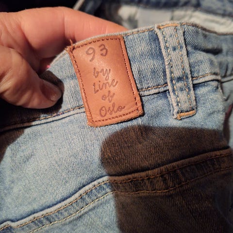 God og behagelig olabukse / denim / dongeri. Står str. 28, men de har rettet til 30 på lappen i butikken, og jeg vil si den også passer 32 tommer i livet, da den måler ca 80cm rundt linningen. Innerbenlengden er 77cm. Passer damestr. 40. Fin modell med rette ben og kul råkant nederst.