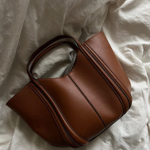 Selger en flott veske i ekte, brunt skinn.