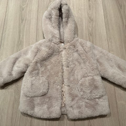 Stilig Grå Pelsjakke i størrelse 92-98, designet for jenter fra Nutmeg (UK). Jakken har et mykt, pelslignende materiale, sateng innsiden og en knappelukking foran. Ingen synlig bruksmerker og nylig vasket. Hentes på Klemetsrud/Mortensrud eller sendes med Fiks ferdig.
