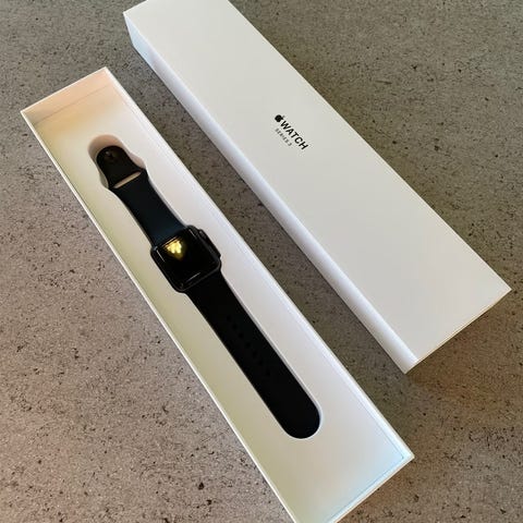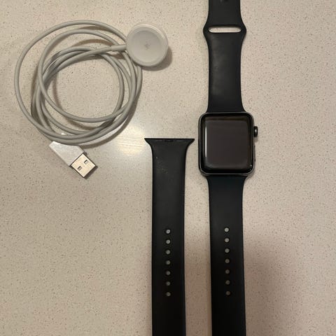 En brukt apple watch ( hvit og silver) med lader, eske og ekstra tilbehør.