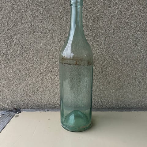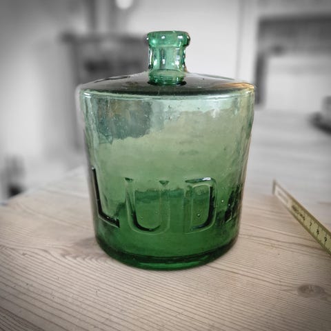 Eldre flaske merket med Lut. Irr-grønn farge. Kitch. Stilig.