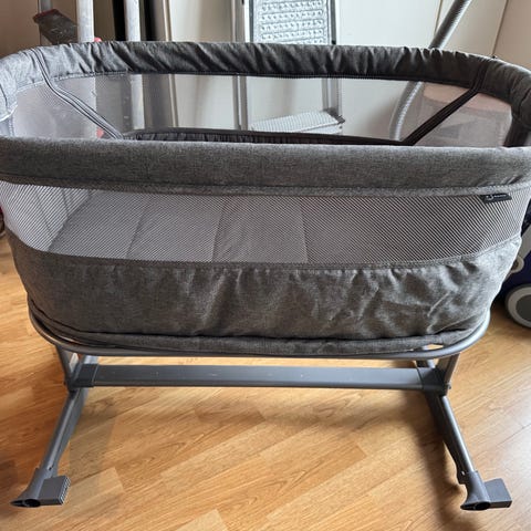 Meget fint brukt Carena Väddö bedside krybbe i fargen mørk grå. Sengen har hjul som kan låses. Sengen kan justeres i flere høyder slik at den passer til foreldrenes seng. Den ene siden kan tas ned.