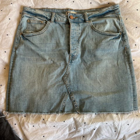 Gina Tricot Perfect Jean denimskjørt i blå farge, størrelse 42. Skjørtet har en lagdelt design med frynsete kanter og lommer foran og bak. Laget av denimmateriale, egnet for kvinner.