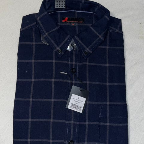 Marineblå skjorte fra Dressmann. 98% bomull og 2% elastan som gjør at den puster godt samtidig som den har litt stretch. Ingen flekker, flekken på bildet er vann fra steameren.