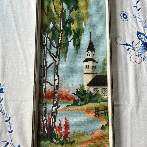 Broderi av kirke ved vann. Rammet inn uten glass. Str 15,5 x 44 cm. Sendes mot porto.