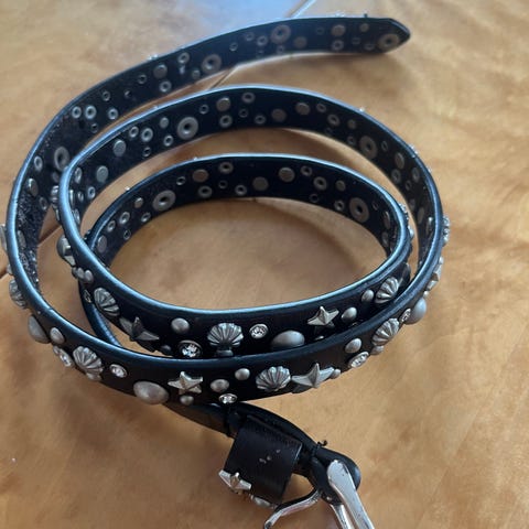 Størrelse 85 cm. Rustrød farge. Ekte lær med dekorative detaljer i metall og stener i glass.