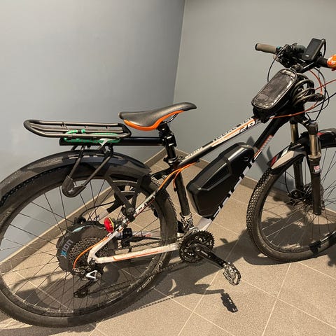 Brukt 2 ganger. Festes på stangen under setet ditt. Solid.