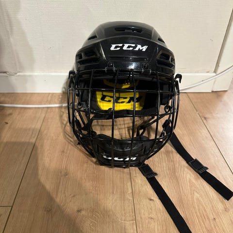CCM Tacks 210 hockeyhjelm i størrelse Large. Hjelmen er hvit og kommer med svart gitter for ansiktsbeskyttelse. Egnet for ishockeyspillere som trenger beskyttelse under kamp eller trening. Litt bruksmerker